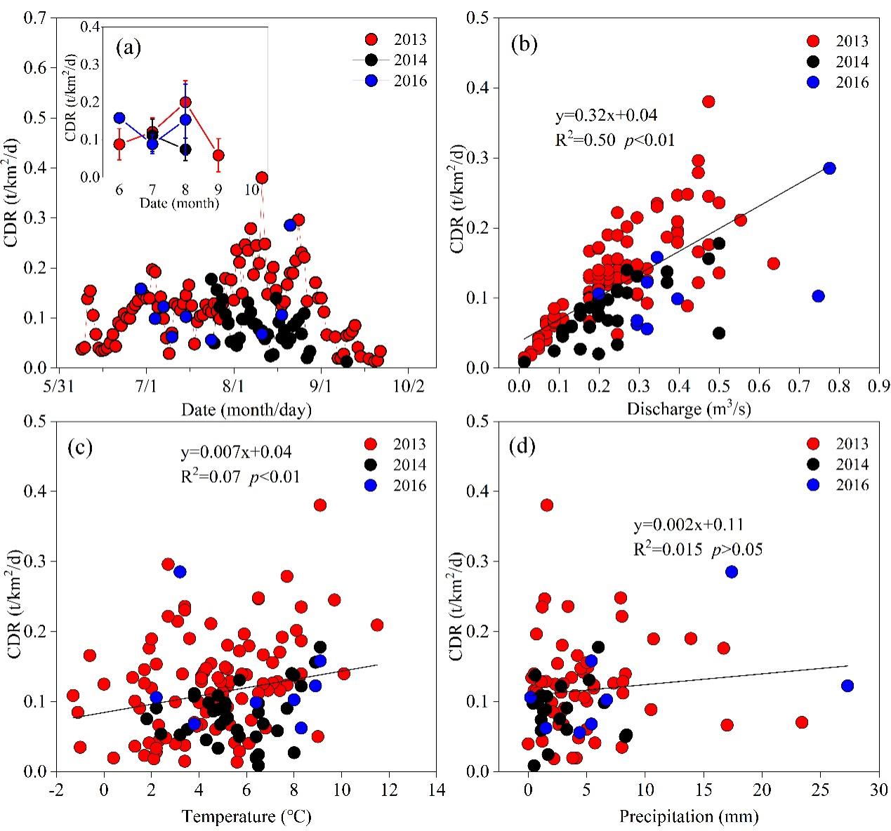 圖2. 2013、2014和2016年烏魯木齊1號(hào)冰川流域陽離子剝蝕率(CDR)日、月變化(a)及其與