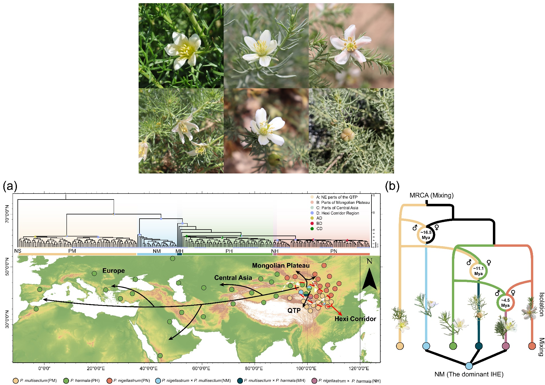 中國科學(xué)院西北高原生物研究所青藏高原植物適應(yīng)與進(jìn)化研究團(tuán)隊(duì)綜合利用Illumina二代測序、Oxford Nanopore三代測序及Hi-C互作圖譜技術(shù),成功構(gòu)建了多裂駱駝蓬的高質(zhì)量染色體水平參考基因組(2n=2x=24,基因組大小為314.37 Mb)?;谥衼喐珊祬^(qū)及其周邊地區(qū)的廣泛采樣,本研究對駱駝蓬屬及其中間形態(tài)類群的28個(gè)群體共284個(gè)個(gè)體進(jìn)行了全基因組重測序。研究結(jié)果表明,駱駝蓬屬起源于河西走廊地區(qū),通過擴(kuò)散作用和地理隔離形成了多裂駱駝蓬、駱駝蒿和駱駝蓬的異域物種形成。隨后,這些物種再次擴(kuò)散至河西走廊地區(qū),通過頻繁的基因交流演化出多種間斷雜交實(shí)體。本研究首次在中亞干旱區(qū)揭示了駱駝蓬屬的物種形成符合“混合-隔離-混合循環(huán)”(MIM cycles,Mixing-Isolation-Mixing cycles)的演化框架,解析了雜交物種形成的中間過渡階段。此外,研究發(fā)現(xiàn),間斷雜交實(shí)體通過基因交流繼承了親本的優(yōu)良性狀(如DNA損傷修復(fù)能力和抗旱適應(yīng)性),從而在自然選擇中表現(xiàn)出顯著的優(yōu)勢。通過對不同物種的轉(zhuǎn)錄組測序分析,進(jìn)一步驗(yàn)證了間斷雜交實(shí)體中與適應(yīng)性進(jìn)化相關(guān)的基因存在顯著差異表達(dá)。本研究通過對中亞干旱區(qū)駱駝蓬屬的系統(tǒng)性群體遺傳學(xué)研究,揭示了其獨(dú)特的物種形成模式,為雜交物種形成中間階段的研究提供了重要的模式類群,并為物種與雜交種間的適應(yīng)性進(jìn)化機(jī)制提供了新的理論依據(jù)。