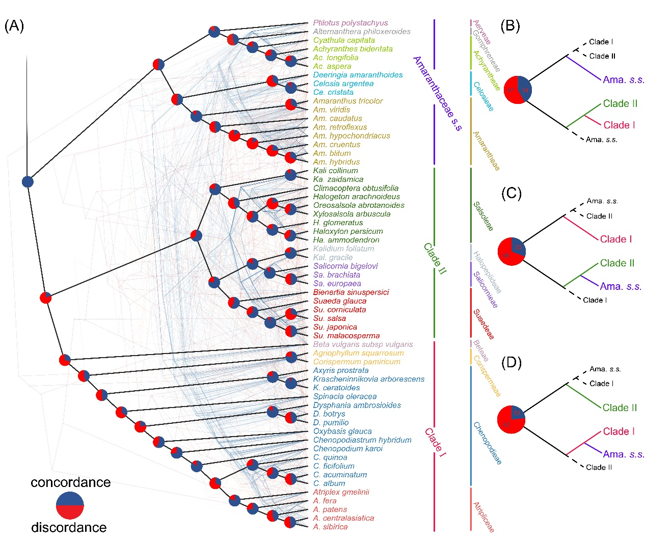 中國科學(xué)院西北高原生物研究所青藏高原植物適應(yīng)與進(jìn)化研究團(tuán)隊(duì)綜合利用質(zhì)體基因組和全長ITS序列,重建了廣義莧科的系統(tǒng)發(fā)育關(guān)系。通過質(zhì)體基因組結(jié)構(gòu)和序列比對(duì)分析,發(fā)現(xiàn)濱藜屬(Atriplex)和藜屬(Chenopodium)存在一段長約5200 bp的反向互補(bǔ)區(qū)域。適應(yīng)性進(jìn)化分析揭示了8個(gè)基因受到顯著的正選擇作用,這些基因可能在廣義莧科的進(jìn)化中起到了驅(qū)動(dòng)作用。系統(tǒng)發(fā)育結(jié)果表明,傳統(tǒng)藜科為單系類群,建議恢復(fù)其至科級(jí)分類學(xué)水平。對(duì)于廣義莧科的科級(jí)以下分類群,例如藜屬、鹽生草屬(Halogeton)以及豬毛菜亞族(Subtr. Salsolinae)為并系類群,建議通過建立更多的分類群或?qū)⑥甲澹–henopodieae)和濱藜族(Atripliceae)合并來解決分類問題。核質(zhì)沖突及不完全譜系分選是導(dǎo)致廣義莧科基因樹系統(tǒng)發(fā)育不一致的主要原因。本研究為廣義莧科的系統(tǒng)發(fā)育關(guān)系提供了新的見解,并指出后續(xù)仍需采取多種數(shù)據(jù)集完善廣義莧科的分類修訂。