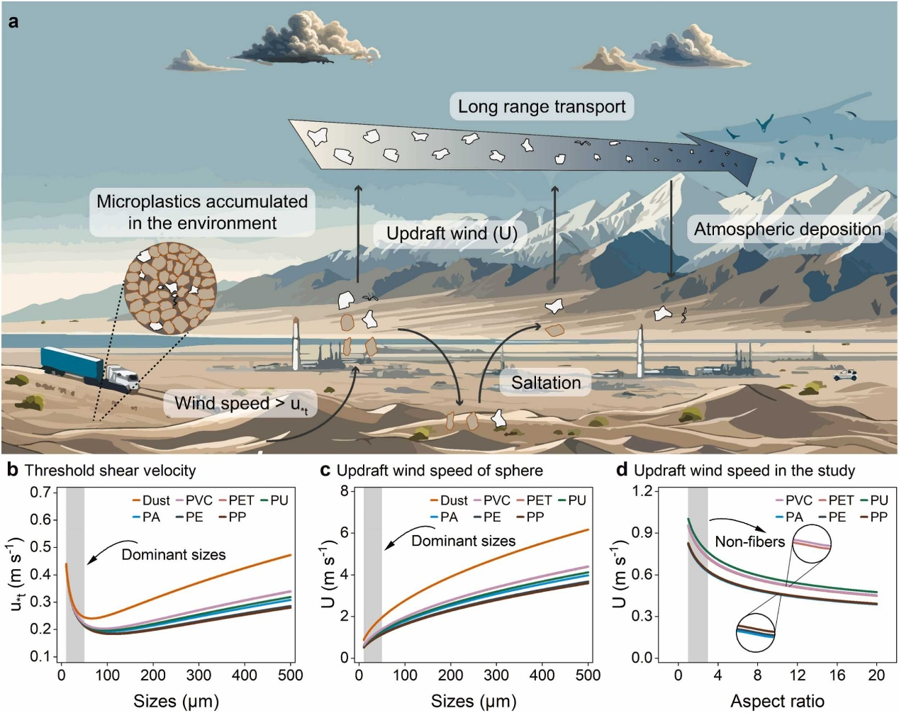 研究團(tuán)隊(duì)通過對(duì)祁連山地區(qū)的總懸浮顆粒物進(jìn)行系統(tǒng)采樣,探究了該地區(qū)的大氣微塑料污染,并使用拉格朗日粒子擴(kuò)散模型探索了大氣微塑料的潛在源區(qū)。結(jié)果顯示,大氣微塑料數(shù)量濃度為4.07±2.37 個(gè) m-3,在春季最高;大氣微塑料質(zhì)量濃度為0.126±0.152 μg m-3,在冬季最大。微塑料主要聚合物類型為PA、PE、PET、PP、PU和PVC,微塑料數(shù)量集中在小于50微米的尺寸,形狀以碎片為主。局地人類活動(dòng)對(duì)大氣中微塑料濃度的影響有限,潛在源區(qū)的粉塵排放顯著影響大氣微塑料濃度。粉塵和微塑料的相似閾值剪切速度表明它們?cè)跐撛谠磪^(qū)的沙塵事件期間共同排放。一旦微塑料被夾帶到氣流中,微塑料懸浮所需較低的上升風(fēng)速會(huì)促進(jìn)微塑料長距離大氣傳輸。