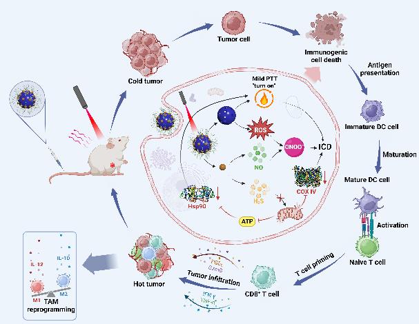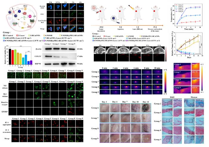 該研究利用雙模態(tài)探針和熒光-質(zhì)譜成像聯(lián)用動態(tài)可視化技術(shù),揭示了三重協(xié)同抗腫瘤的作用機制。結(jié)果表明,利用納米馬達(dá),通過中空硫化銅納米顆粒HCuSNPs負(fù)載氣體信號分子供體NOSH,在808 nm激光照射下可控釋放H?S/NO,同時高效轉(zhuǎn)換光能(光熱轉(zhuǎn)化效率達(dá)27.8%),確保局部溫度維持在45℃以下,既能殺傷腫瘤細(xì)胞,又避免正常組織損傷。此外,該納米馬達(dá)不僅通過H?S阻斷線粒體能量代謝、NO-ROS反應(yīng)生成ONOO?雙路徑誘導(dǎo)腫瘤凋亡,還可顯著重塑腫瘤免疫微環(huán)境,促進(jìn)M1型巨噬細(xì)胞極化(比例提升3倍)、CTLs浸潤(增加5倍),全面提升免疫抗癌能力。