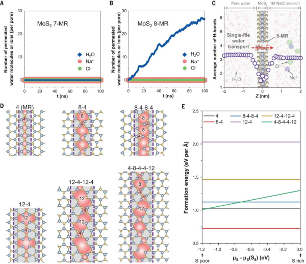 石國(guó)升研究員團(tuán)隊(duì)基于前期水合離子界面相互作用的新理解,原創(chuàng)性提出離子可以精準(zhǔn)調(diào)控二維通道尺寸,“裝訂”石墨烯膜用于離子篩分和海水淡化,此外還首次揭示自然條件下反常化學(xué)計(jì)量比晶體Na2Cl/Na3Cl/K2Cl/Li2Cl/CaCl等反晶[Sci. Rep. 3,3436(2013);?Angew. Chem. Int. Ed. 10,10190 (2014);Phys. Rev. Lett. 134,12104 (2015);Phys. Rev. Lett. 117,238102 (2016);Nature 550,380 (2017);Nat. Chem. 10,694 (2018);Natl. Sci. Rev. 8,nwaa274 (2021);J. Colloid Interface Sci. 648,102 (2023);Nano Lett. 23,10884 (2023);Nat. Water 1,800 (2023);Small 60,21,2408566 (2025);J. Hazard. Mater. 487,137078 (2025);J. Am.Chem. Soc. 147,3478 (2025);Nano Lett. 25,2334 (2025)]?;谶@些前期工作對(duì)界面水合離子相互作用的理解以及對(duì)受限空間離子篩分和輸運(yùn)行為的認(rèn)識(shí),進(jìn)一步發(fā)現(xiàn)通過(guò)調(diào)控MoS2晶界納米孔缺陷尺寸,可以實(shí)現(xiàn)有效水/離子分離和離子精準(zhǔn)篩分,達(dá)到海水淡化及離子精準(zhǔn)提取的效果。