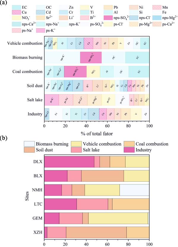 研究表明,柴達(dá)木盆地大氣降塵中石鹽和石膏的含量范圍為 0 至 47 wt%,鹽塵沉積通量(SDF)在 0 至 2.54 g/m2·30d 之間變化,其主要可溶性離子包括nps-SO42?、ps-Cl??和ps-Na+。不同采樣點(diǎn)的ps和nps組分的分布趨勢(shì)與可溶性離子相似,ps-Na+和ps-Cl–占比分別為49.52±34.59%和58.14±40.02%,表明鹽湖排放顯著影響降塵成分。源解析結(jié)果顯示,鹽湖排放貢獻(xiàn)了降塵來源的 5.23% ~ 29.76%,顯示了鹽湖來源的粉塵對(duì)大氣降塵具有不可忽視的重要貢獻(xiàn)。