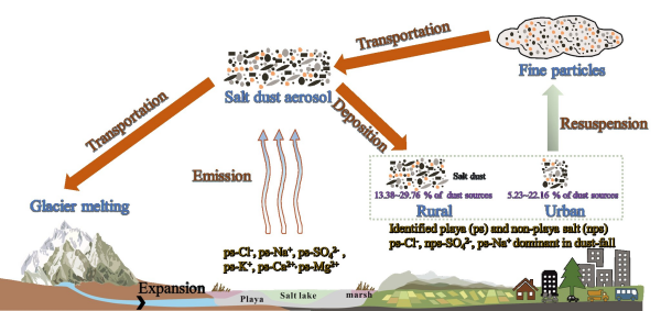 研究表明,鹽塵可能是內(nèi)陸地區(qū)Na?和Cl?離子的重要來源,尤其是在春季和冬季,西北風(fēng)將大量鹽塵輸送到下游地區(qū),甚至影響到東亞和更廣泛區(qū)域的空氣質(zhì)量。此外,鹽塵的排放可能形成一個(gè)區(qū)域正反饋循環(huán):鹽塵加劇了冰川的消融,冰川融化則增加了河流徑流量,進(jìn)而擴(kuò)大了鹽湖及周邊鹽漬土的范圍,從而導(dǎo)致更多的鹽塵釋放到大氣中并進(jìn)一步加速冰川融化。這一認(rèn)識(shí)對(duì)全球生態(tài)安全和水資源管理具有重要啟示意義。這項(xiàng)研究系統(tǒng)評(píng)估了鹽塵排放對(duì)大氣顆粒物沉積的貢獻(xiàn),揭示了鹽塵在區(qū)域及全球氣候環(huán)境變化中的潛在作用。根據(jù)本研究結(jié)果,建議在全球變暖背景下,未來制訂環(huán)境政策和構(gòu)建氣候模型時(shí)需要更多地關(guān)注內(nèi)陸鹽湖粉塵的影響。