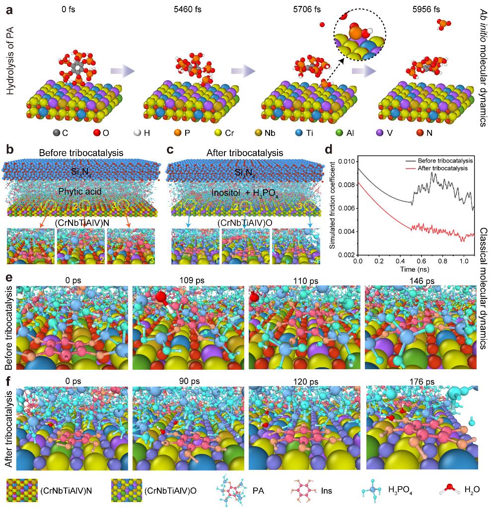 經(jīng)測(cè)試,該固-液復(fù)合超潤(rùn)滑體系可在125萬(wàn)次往復(fù)摩擦循環(huán)中持續(xù)保持超潤(rùn)滑狀態(tài),摩擦系數(shù)低至0.0037,磨損率約為3.032×10?10mm3/(N·m)。摩擦過(guò)程中原位形成了平均粒徑約為7.3nm的高熵陶瓷納米晶體,這些納米晶體促進(jìn)了植酸分子的水解,生成了肌醇多磷酸(或肌醇)和磷酸分子。通過(guò)分子動(dòng)力學(xué)模擬進(jìn)一步證明,肌醇和磷酸在滑動(dòng)過(guò)程中可有效降低摩擦阻力,從而在宏觀尺度上實(shí)現(xiàn)固-液復(fù)合超潤(rùn)滑(圖2)。該研究證實(shí)了摩擦催化效應(yīng)在超潤(rùn)滑中的作用,為設(shè)計(jì)高性能固-液復(fù)合超潤(rùn)滑系統(tǒng)提供了新策略。