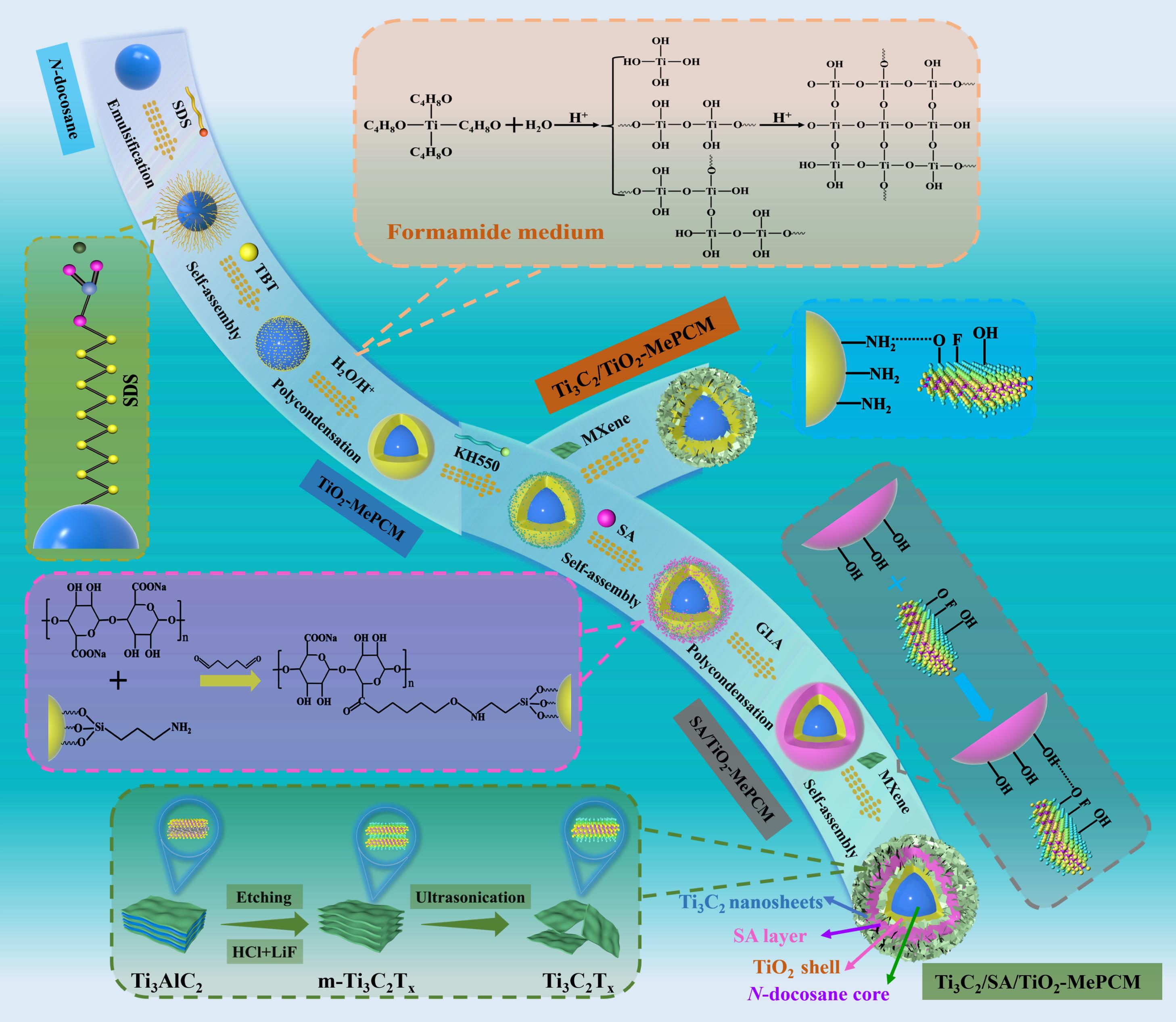 圖1. Ti3C2Tx修飾相變微膠囊的合成策略及反應(yīng)機(jī)理示意圖