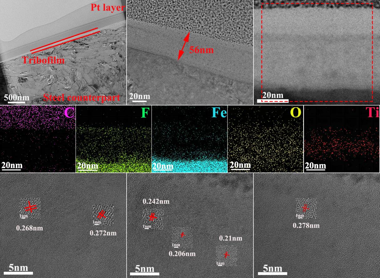 近期,針對(duì)纖維織物自潤(rùn)滑復(fù)合材料摩擦學(xué)性能協(xié)同優(yōu)化的技術(shù)難題,研究團(tuán)隊(duì)基于前期研究基礎(chǔ),制備了具有核殼結(jié)構(gòu)的Ti3C2/SA/TiO2-MePCM相變微膠囊。該微膠囊以機(jī)械強(qiáng)度優(yōu)異的二氧化鈦為殼層增強(qiáng)復(fù)合材料力學(xué)性能,內(nèi)核正二十二烷通過相變作用吸收摩擦熱并實(shí)現(xiàn)局部固-液協(xié)同潤(rùn)滑,同時(shí)二維材料Ti3C2Tx憑借其層間滑移特性和高承載能力有效降低復(fù)合材料的摩擦損傷。實(shí)驗(yàn)數(shù)據(jù)表明,引入該微膠囊后纖維織物自潤(rùn)滑復(fù)合材料的摩擦系數(shù)由0.053降至0.046,磨損率由8.9×10-14m3 (N·m)-1顯著降低至3.5×10-14m3(N·m)-1。研究團(tuán)隊(duì)通過多種表征技術(shù)系統(tǒng)解析了摩擦膜的微觀形貌演變規(guī)律,闡明了織物復(fù)合材料的減摩抗磨作用機(jī)制,為核殼結(jié)構(gòu)材料在摩擦學(xué)領(lǐng)域的創(chuàng)新應(yīng)用提供了理論支撐。