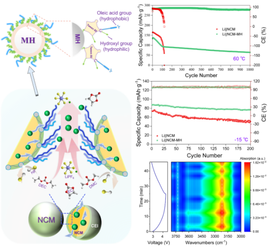 研究團隊首先以Tween80為框架物質(zhì)構(gòu)建一種弱交聯(lián)柔性受限空間,電沉積獲得所需超細納米氫氧化鎂載體(D50=15 nm),并通過Tween80原位改性實現(xiàn)納米氫氧化鎂功能化。用所得材料對鋰電池三元正極材料(LiNi0.5Co0.2Mn0.3O2)進行表面修飾,并進行電池組裝和性能測試。原位紅外分析表明,Li?與 Tween80 分子間存在持續(xù)的配位和解離過程,使Tween80 分子荷電狀態(tài)發(fā)生動態(tài)變化,并在電場作用下發(fā)生連續(xù)的構(gòu)型轉(zhuǎn)變,亦即“烷基鏈搖曳”行為。烷基鏈搖曳使得納米氫氧化鎂在電池循環(huán)伊始就參與反應,快速形成薄而致密的富鎂無機正極固態(tài)電解質(zhì)界面膜。這種膜熱穩(wěn)定性高、耐腐蝕性強,能夠有效抵御高溫電解液攻擊。而在低溫環(huán)境下,電解液通常會在正極表面積聚,并常因流動性差而阻礙鋰離子傳輸。此時烷基鏈搖曳可顯著促進電解液的界面流動,兼之富鎂界面層具有優(yōu)異離子導電性,使鋰離子低溫傳輸變得非常順暢。研究結(jié)果表明,通過“烷基鏈搖曳”界面驅(qū)動設計,鋰離子電池可在60℃穩(wěn)定充放電1000圈以上,同時保持70 mAh/g容量和90%以上庫侖效率。在-5℃和-15℃分別循環(huán)500圈、200圈后,容量仍能保持在80 mAh/g以上。該研究在配備熱管控系統(tǒng)后,電池實際寬溫域性能有望進一步提升。
