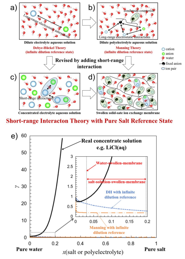 受Kenneth S. Pitzer濃電解質(zhì)溶液理論啟發(fā),研究人員認(rèn)為:離子交換膜的反離子凝聚效應(yīng)相較曼寧理論所描述的稀聚電解質(zhì)溶液要強(qiáng)的多;在純水溶脹的離子交換膜中,絕大多數(shù)的反離子處于凝聚狀態(tài),有效的屏蔽了聚合物鏈上的電荷。因此,自由離子之間的短程作用,而非長(zhǎng)程靜電作用,才是決定性的。這點(diǎn)與忽略長(zhǎng)程靜電作用的濃電解質(zhì)溶液理論完全一致。據(jù)此,研究人員創(chuàng)新性提出了"純水溶脹膜參考態(tài)"——首次明確區(qū)分了膜內(nèi)反離子與溶液相中反離子的標(biāo)準(zhǔn)化學(xué)勢(shì)。
