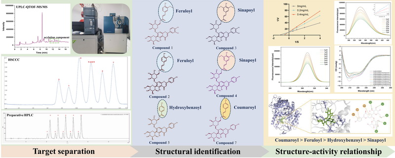 中國科學(xué)院西北高原生物研究所高原藏藥資源質(zhì)控與藥理毒理評價研究團隊通過建立UPLC-QTOF-MS/MS結(jié)合高速逆流色譜和制備液相色譜的靶向分離技術(shù),成功從青稞苗中分離得到6個以大麥黃苷和皂草黃苷為母核的不同酰基修飾的衍生物。通過多維度的分子相互作用研究發(fā)現(xiàn),大麥黃苷和皂草黃苷?;?,其α-葡萄糖苷酶抑制活性均明顯提高,表現(xiàn)為香豆酰基>阿魏?;?gt;對羥基苯甲酰基>芥子?;?個?;S酮與α-葡萄糖苷酶均具有較高的結(jié)合常數(shù),主要通過范德華力和氫鍵作用占據(jù)α-葡萄糖苷酶的活性位點并形成穩(wěn)定的復(fù)合物,并改變關(guān)鍵氨基酸殘基和二級結(jié)構(gòu),從而降低酶催化活性。該研究為復(fù)雜天然產(chǎn)物的靶向分離純化以及?;S酮與α-葡萄糖苷酶抑制活性之間的構(gòu)效關(guān)系的研究提供了新的思路。