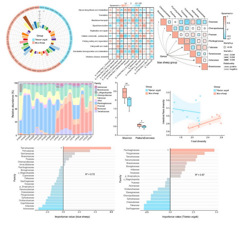 中國科學(xué)院西北高原生物研究所動(dòng)物生態(tài)與資源保護(hù)研究團(tuán)隊(duì)在青海省昆侖山地區(qū)采集了西藏盤羊與巖羊的新鮮糞便樣本,結(jié)合宏基因組測(cè)序與植物 trnL片段的高通量測(cè)序技術(shù),深入分析了兩者腸道菌群組成、功能特征及食性結(jié)構(gòu)與腸道菌群在生態(tài)適應(yīng)與營養(yǎng)生態(tài)位分化中的潛在作用。研究發(fā)現(xiàn),西藏盤羊與巖羊共棲于高寒生態(tài)環(huán)境中,但其腸道菌群在組成結(jié)構(gòu)與功能特征方面表現(xiàn)出了顯著差異。食性多樣性的高低并不必然反映腸道菌群多樣性的水平,其中西藏盤羊雖食性相對(duì)單一,但其腸道菌群多樣性更高,具有更強(qiáng)的代謝適應(yīng)性與纖維降解能力;而巖羊擁有更廣泛的植物攝食譜,卻表現(xiàn)出在糖類代謝相關(guān)功能上更強(qiáng)的腸道菌群代謝適應(yīng)能力。綜合來看,腸道菌群與食性之間的協(xié)同作用可能在推動(dòng)兩物種營養(yǎng)生態(tài)位分化中發(fā)揮重要作用。此外,兩種動(dòng)物在抗生素耐藥基因組成上也存在差異,提示該類指標(biāo)在未來野生動(dòng)物健康評(píng)估中具有潛在應(yīng)用價(jià)值。本研究揭示了腸道菌群作為宿主環(huán)境適應(yīng)和生態(tài)位分化的重要調(diào)控因子,其與食性協(xié)同作用推動(dòng)了高原野生動(dòng)物的生態(tài)位分化。研究成果為理解大型食草動(dòng)物腸道菌群與環(huán)境適應(yīng)及生態(tài)位分化提供了全新視角,也為瀕危物種保護(hù)和高原生態(tài)系統(tǒng)可持續(xù)發(fā)展提供了重要參考。