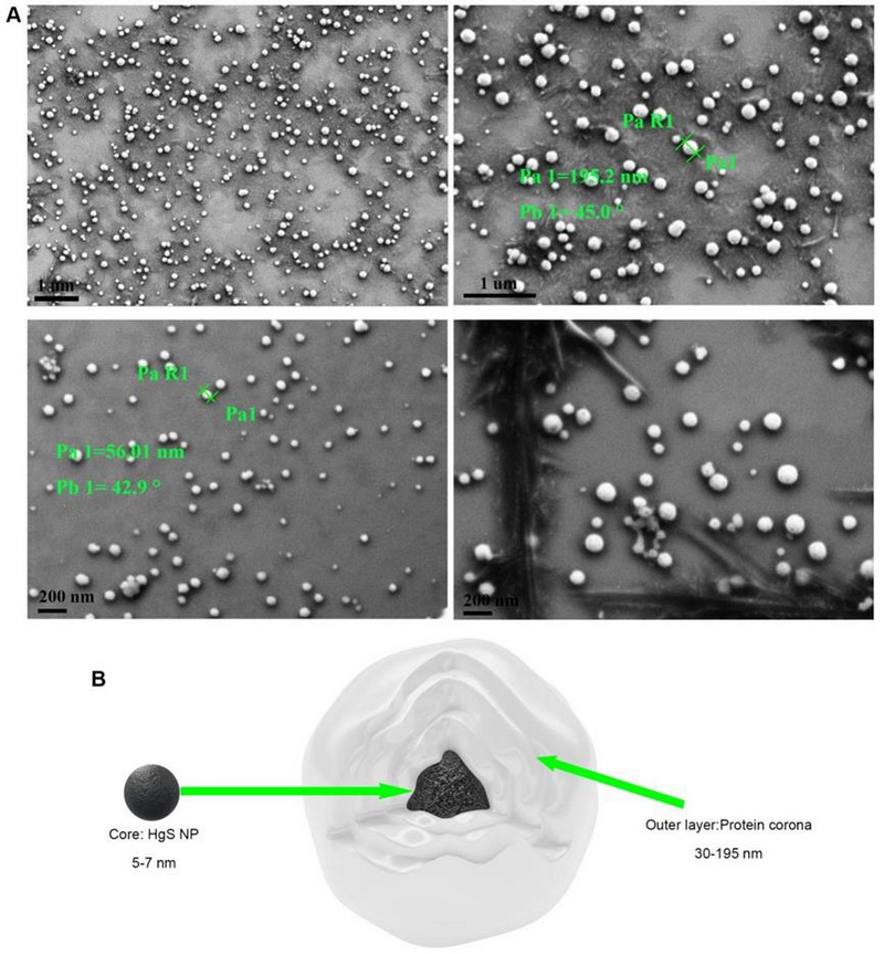 中國科學院西北高原生物研究所高原藥用資源生態(tài)保護與繁育研究團隊通過建立創(chuàng)新性金屬制劑研究體系,首次在細胞、小鼠和人體血液中證實金屬制劑能夠被生物合成為粒徑均一的HgS 納米顆粒。更重要的是通過分離純化手段首次觀察到具有完整蛋白冠的金屬納米顆粒。相對純凈完整結構的呈現(xiàn)不僅直觀證實了蛋白冠的存在,也為蛋白冠中蛋白質的分析奠定了基礎。蛋白冠蛋白質組成一直以來存在巨大分歧。本研究中通過分析HgS納米顆粒蛋白質組成,證實金屬納米顆粒蛋白冠中蛋白質類型多樣,初步排除了蛋白冠僅由血清白蛋白組成的相關報道。