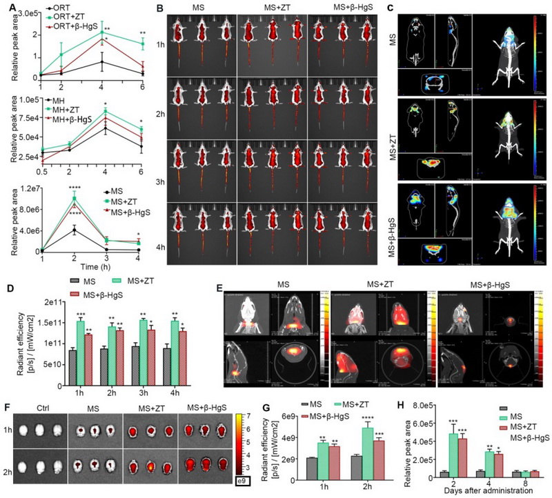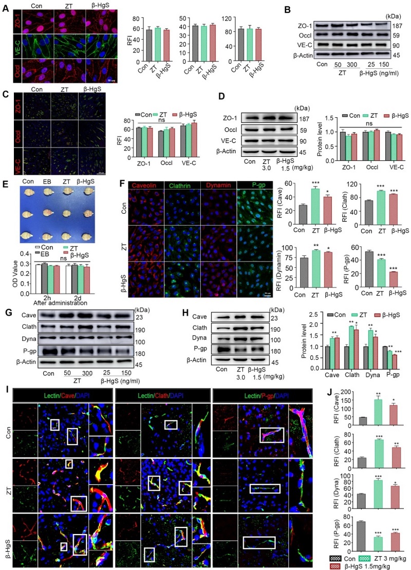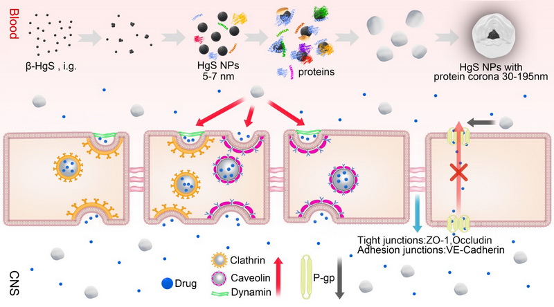 通過細胞蛋白組學分析結合體內外蛋白驗證,初步證實金屬制劑主要通過調節(jié)血腦屏障中的轉胞吞作用實現(xiàn)高效的跨腦遞藥功能。它能夠通過上調腦微血管中caveolin,clathrin,和 dynamin蛋白的表達促進藥物向腦內轉運,同時顯著降低 P-gp的表達,以減少血腦屏障對藥物的外排作用,從而實現(xiàn)藥物在腦內的高效富集。另外,值得關注的是,HgS金屬制劑并沒有引起血腦屏障緊密連接相關蛋白的表達降低,說明它對藥物的入腦作用并不是通過血腦屏障結構的暫時性開放而實現(xiàn)的。