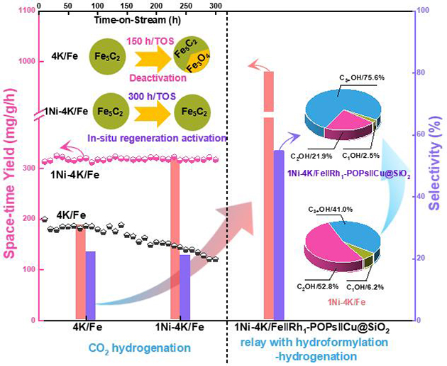 系統(tǒng)研究表明,在K-Ni共修飾的Fe催化劑中,K-Ni之間的協(xié)同作用機(jī)制顯著提升了C2+OH生成的時(shí)空收率,Ni的引入促進(jìn)了*CHx中間體形成,K的存在能抑制*CHx深度加氫,二者協(xié)同增強(qiáng)了*CO-*CHx偶聯(lián)。同時(shí),K和Ni的引入能夠加速活性相Fe5C2的生成與原位再碳化,因此,在表現(xiàn)出高活性的同時(shí),還展示出較好的使用穩(wěn)定性。
