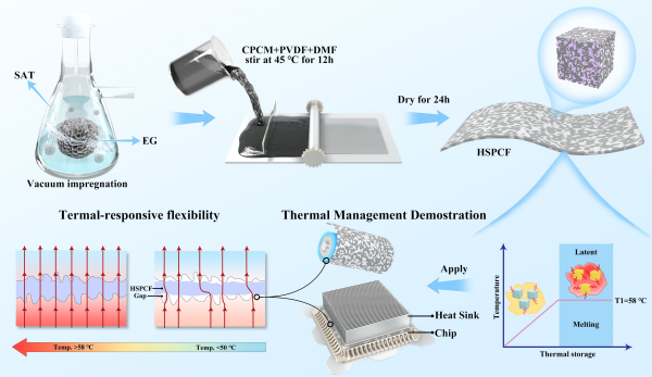 青海鹽湖所溶液結(jié)構(gòu)與界面課題組研究團(tuán)隊以三水醋酸鈉(SAT)作為相變材料,多孔膨脹石墨構(gòu)建封裝空間,設(shè)計了一種無機(jī)相變薄膜。通過膨脹石墨在不同方向?qū)娱g交聯(lián)形成3D多孔支撐骨架構(gòu)建“熱橋”,實現(xiàn)熱量多維度傳遞。并且當(dāng)電子器件臨界熱失控,相變薄膜主動儲存熱量,該“熱傳導(dǎo)+熱吸收”的雙重?zé)峁芾頇C(jī)制有效緩沖電子器件瞬時熱通量,且PVDF的引入使相變薄膜獲得熱誘導(dǎo)柔性、良好的阻燃與電絕緣性能。研究結(jié)果使熱失控電池模塊溫度降低10?℃,CPU表面溫度降低20?℃。