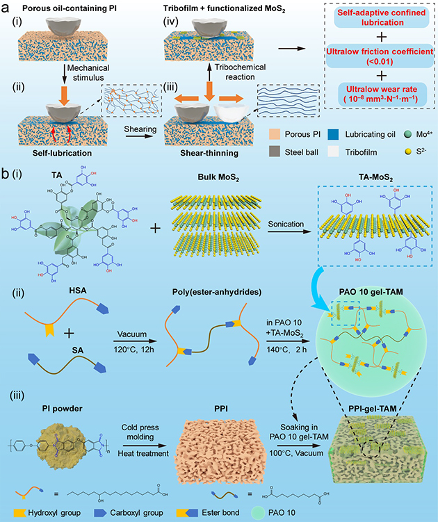 近期,中國科學(xué)院蘭州化學(xué)物理研究所潤滑材料全國重點(diǎn)實(shí)驗(yàn)室王道愛研究員團(tuán)隊(duì)基于"自適應(yīng)限域潤滑"的策略(圖1),設(shè)計制備了MoS2-油凝膠復(fù)合的多孔聚酰亞胺(PPI-gel-TAM),具有高的儲油能力(18.2%)和油保持率(97.7%),實(shí)現(xiàn)了鋼/PPI界面自適應(yīng)的宏觀超潤滑(摩擦系數(shù):~0.007)和超低的磨損率(2.81×10-8·mm3·N-1·m-1),展現(xiàn)出出色的摩擦學(xué)性能,為未來發(fā)展高性能的工程極限潤滑材料提供了新的見解和思路。