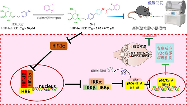 研究團(tuán)隊聚焦高原腦水腫防治重大問題,以高原特色中草藥紅景天中的活性成分紅景天苷為結(jié)構(gòu)基礎(chǔ),基于骨架躍遷和分子雜合的藥物設(shè)計策略,通過引入鄰氟苯基HIF-1α抑制劑藥效團(tuán),對紅景天苷的糖苷鍵、連接鏈、芳環(huán)取代基等三個部分進(jìn)行結(jié)構(gòu)修飾,設(shè)計并合成了多種紅景天苷衍生物開展構(gòu)效關(guān)系研究。通過雙熒光素酶報告基因、細(xì)胞毒、ELISA等實驗,篩選獲得強(qiáng)活性化合物N41,可顯著抑制HIF-1α HRE轉(zhuǎn)錄(IC50: 2.02 ± 0.76 μM),減少C8-D1A細(xì)胞炎癥因子IL-6和NO的表達(dá)以及ROS積累,減輕氧化損傷且無明顯細(xì)胞毒性。HACE小鼠模型研究發(fā)現(xiàn),N41可有效降低HACE模型小鼠腦含水量,改善缺氧導(dǎo)致的腦組織損傷,通過阻斷HIF-1α/IKKα/NF-κB信號通路,抑制下游TNF-α、IL-6等炎癥因子及MMP-9、AQP-4等血腦屏障通透性相關(guān)因子表達(dá),緩解炎癥反應(yīng)和維持血腦屏障完整性,發(fā)揮高原腦水腫防治功效。相關(guān)研究成果發(fā)表在European Journal of Medicinal Chemistry(2025,297: 117982)上。