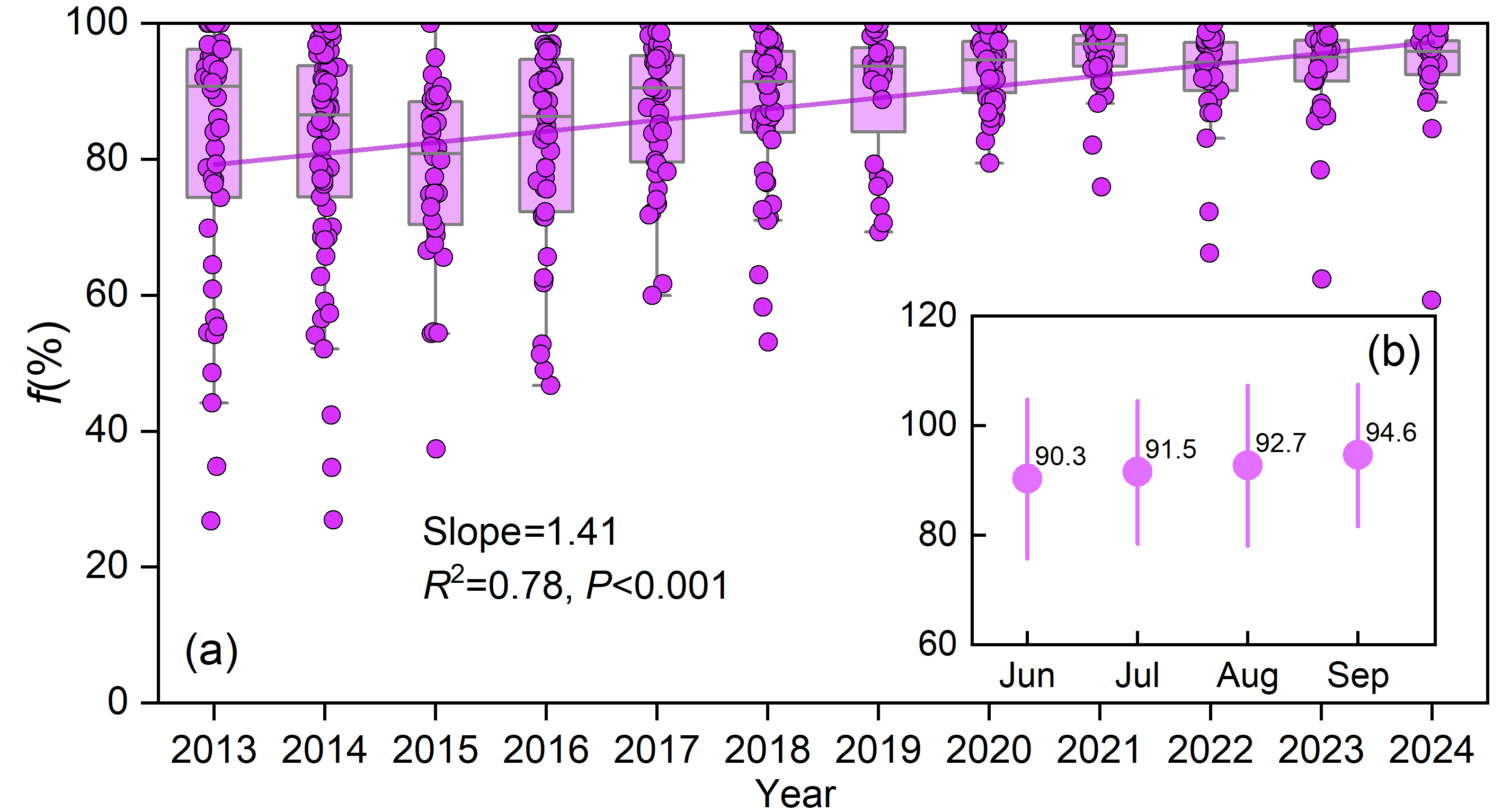 2013至2024年研究區(qū)剩余雨滴組分的時間變化趨勢(a) 年際變化(b) 月度變化