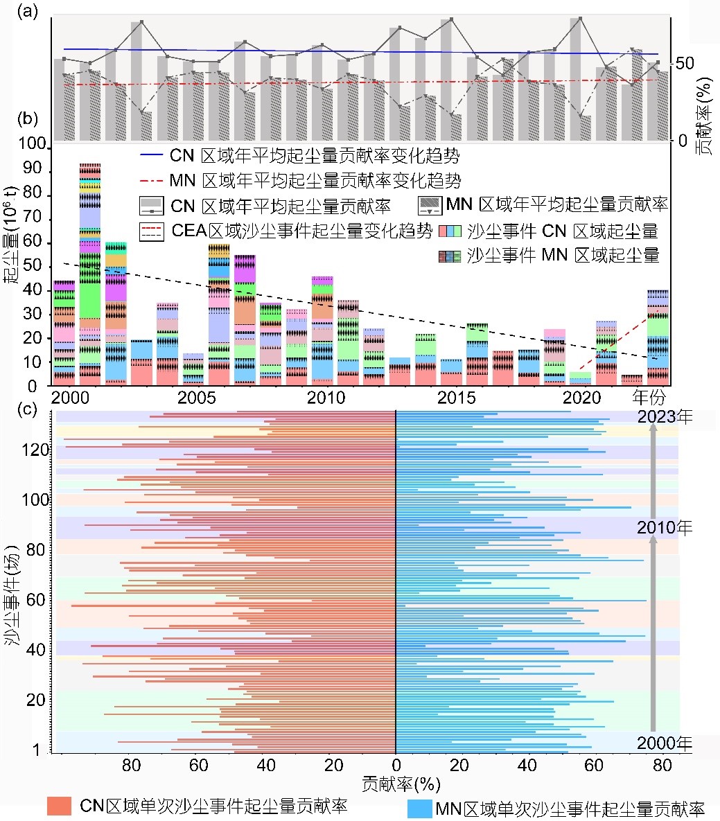 2000-2023年東亞中部地區(qū)中國北方與蒙古國大規(guī)模沙塵事件起塵量及貢獻率變化