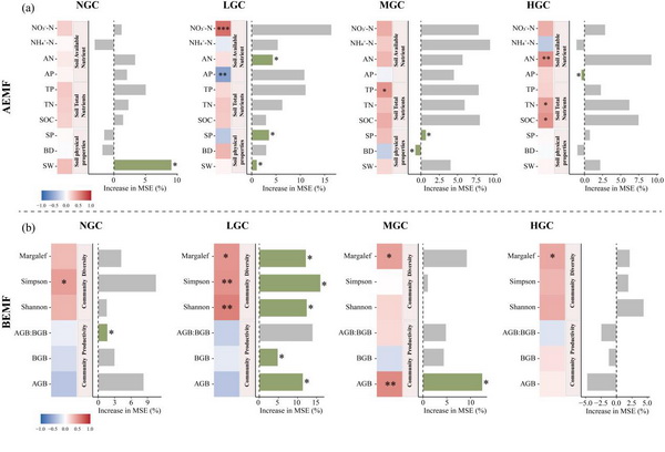 圖1?不同礫石化水平下AEMF與BEMF的相關(guān)性及主要驅(qū)動因子重要性分析