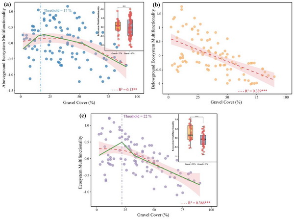 研究發(fā)現(xiàn),隨著礫石覆蓋度的增加,草地植物物種豐富度、功能群組成及生物量顯著下降,尤其是地下生物量的減少最為明顯;土壤含水量、孔隙度及養(yǎng)分含量顯著降低,而容重顯著升高,導(dǎo)致生態(tài)系統(tǒng)整體功能衰退。礫石化不僅直接抑制植物生長,還通過削弱土壤養(yǎng)分供給間接降低生態(tài)系統(tǒng)多功能性。隨機(jī)森林與結(jié)構(gòu)方程模型分析進(jìn)一步揭示,土壤養(yǎng)分和植物多樣性是決定生態(tài)系統(tǒng)多功能性的關(guān)鍵調(diào)控因子。隨礫石化程度加劇,地上功能指數(shù)(AEMF)和地下功能指數(shù)(BEMF)均顯著下降,后者的響應(yīng)更為敏感,當(dāng)?shù)[石覆蓋度超過22%時,生態(tài)系統(tǒng)多功能性(EMF)出現(xiàn)明顯突變性下降,表明該閾值可作為高寒草地退化的早期預(yù)警指標(biāo)。研究指出,高寒草地礫石化退化過程會破壞植物-土壤耦合關(guān)系,導(dǎo)致生態(tài)功能的同步退化。