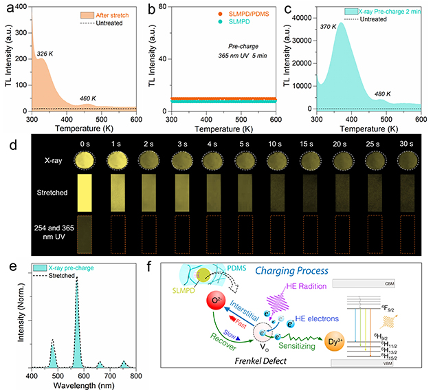 圖1.?SLMPD/PDMS在紫外輻照、X射線輻照和拉伸刺激前后的光譜對比,以及界面高能輻射缺陷物理機制。