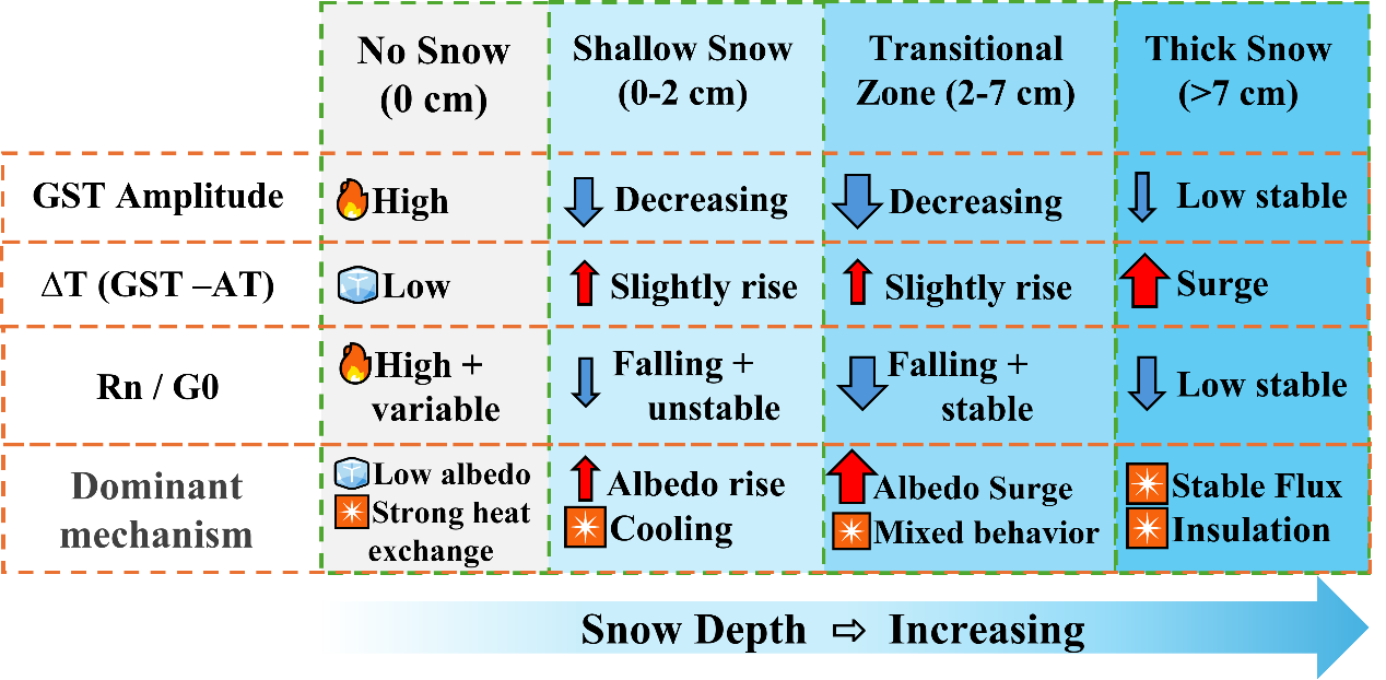 據(jù)此研究提出了“四區(qū)間機(jī)制框架”,即裸地—薄雪(0–2 cm)—過(guò)渡雪(2–7 cm)—厚雪(>7 cm)。該框架刻畫(huà)了從強(qiáng)地–氣耦合的冷卻階段,跨越閾值進(jìn)入穩(wěn)定保溫階段的演變路徑,為淺雪主導(dǎo)區(qū)的雪–地相互作用提供了可操作的判據(jù)與參數(shù)化思路。