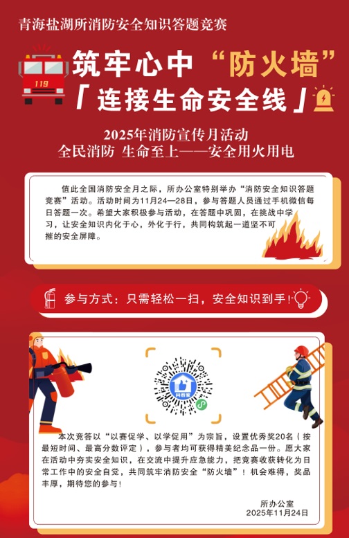 為切實(shí)筑牢消防安全防線(xiàn),提升全員消防安全意識(shí)和應(yīng)急處置能力,在全國(guó)消防月期間,中國(guó)科學(xué)院青海鹽湖研究所創(chuàng)新消防安全教育形式,于11月24日至28日組織開(kāi)展了線(xiàn)上消防安全知識(shí)競(jìng)答活動(dòng),全所100余名職工及學(xué)生通過(guò)掃描二維碼參與活動(dòng),以賽促學(xué)、以學(xué)促用,營(yíng)造了濃厚的消防安全學(xué)習(xí)氛圍。