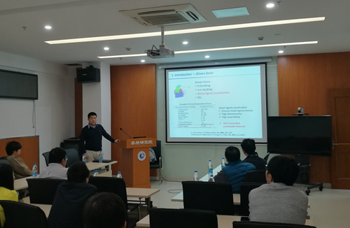 報(bào)告中,王恒博士闡述了平面超分子領(lǐng)域的研究進(jìn)展,詳細(xì)介紹了三種不同代數(shù)(G2-G4)二維平面超分子配體的模塊化合成策略及其自組裝,展示了“配體合成與自組裝一鍋法”的簡便高效合成方法?;谕S六元環(huán)的三維棱柱的構(gòu)筑過程及其自組裝的機(jī)理,可將此類平面超分子拓展至三維立體結(jié)構(gòu)。報(bào)告后,王恒博士同與會(huì)人員就巨型超分子領(lǐng)域的研究進(jìn)行了討論與交流。